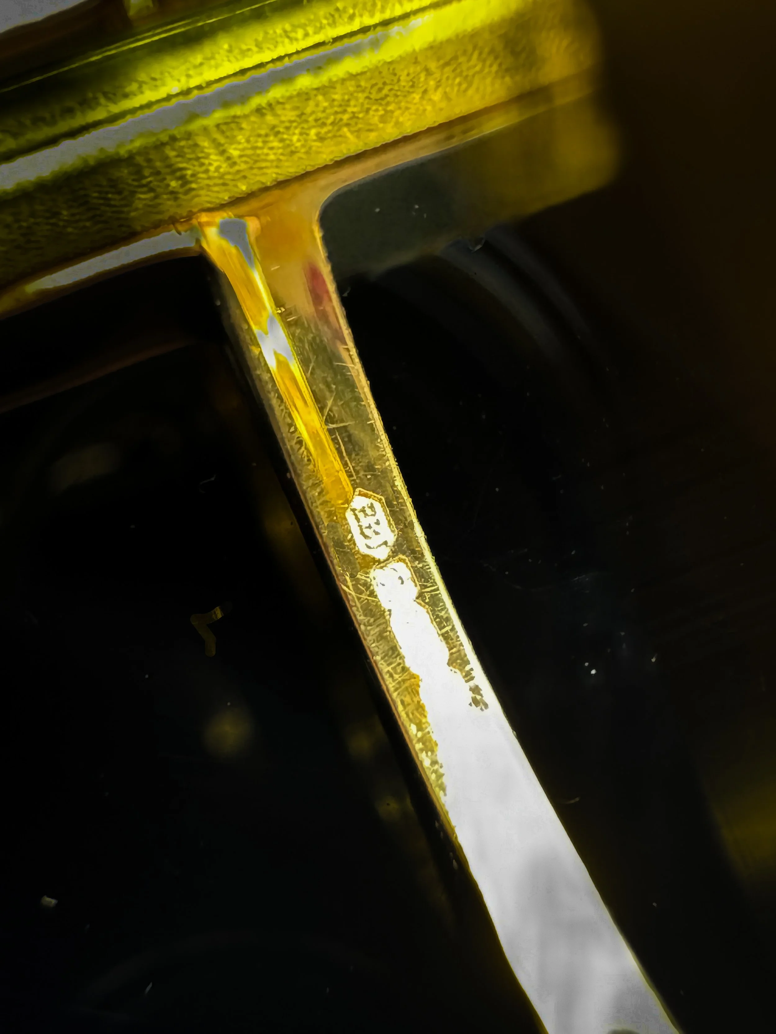 The Traditional fineness symbol, A Millesimal fineness Mark, The Assay Office mark and The Date Letter Mark.